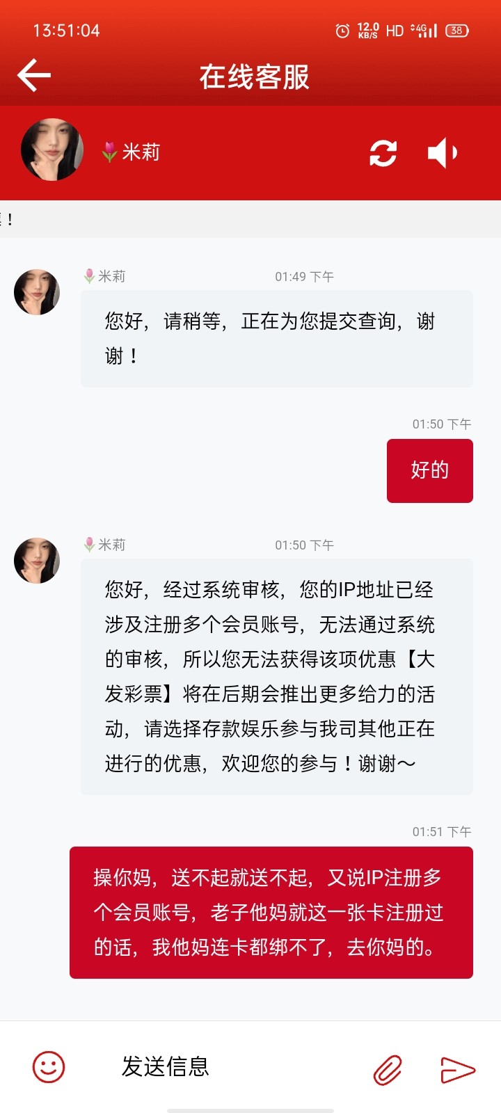 您好,经过系统审核,您的IP地址已经涉及注册多个会员账号,无法通过系统的审核,所以您无法获得该项优惠,晒马汇 将在后期会推出更给力的活动,请选择存款娱乐参与公司的正在进行的优惠,欢迎您的参与!谢谢