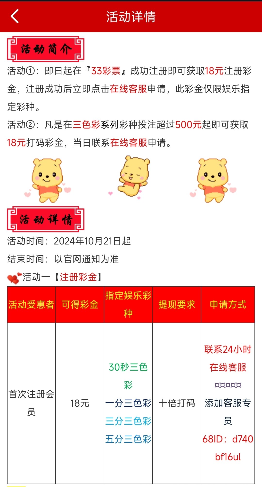 注册完善资料联系客服添加专员领取彩金,10倍流水,仅限投注三色彩系列,查IP,需手持