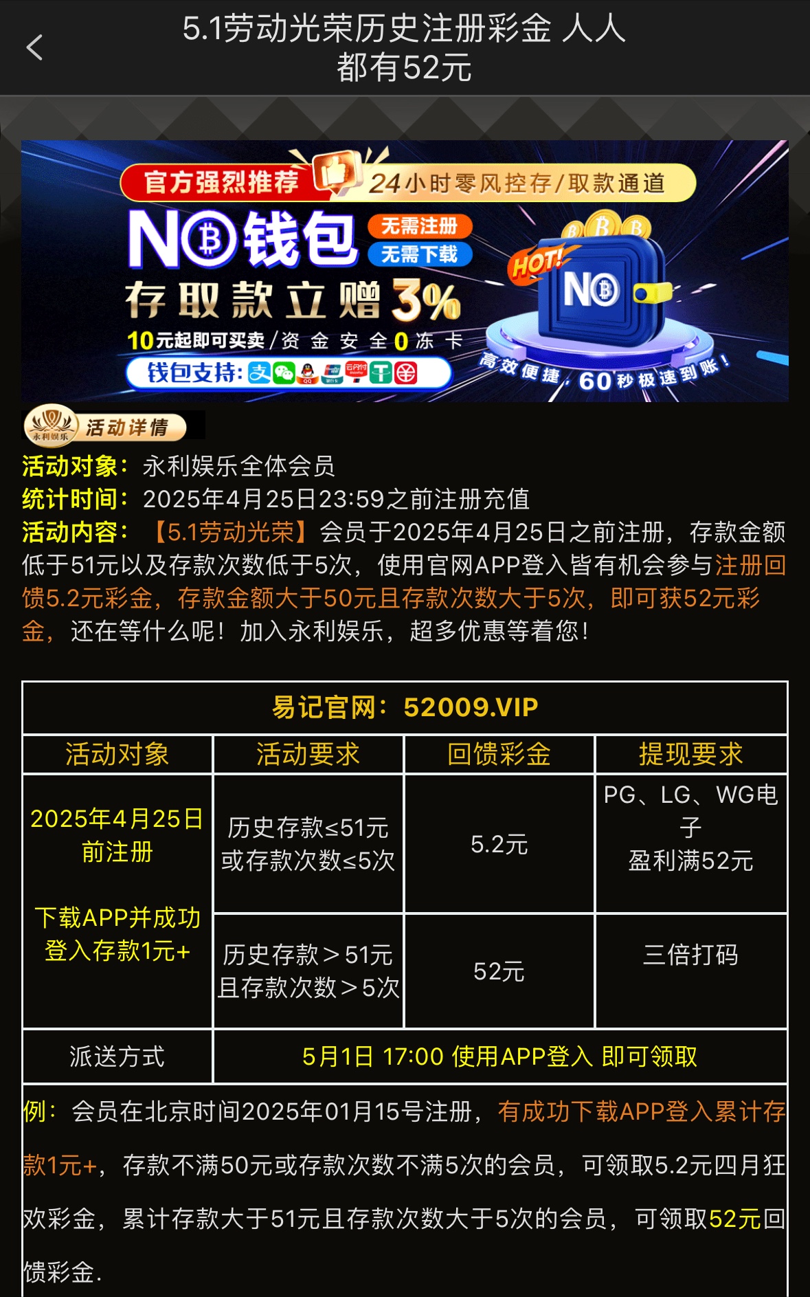 4月25号之前存款过1+的兄弟5.1下午5点登入APP那天上号有5.2的彩金限PG/LG/WG盈利到52才能提款,存款过50以上存款5次以上有52彩金三倍流水